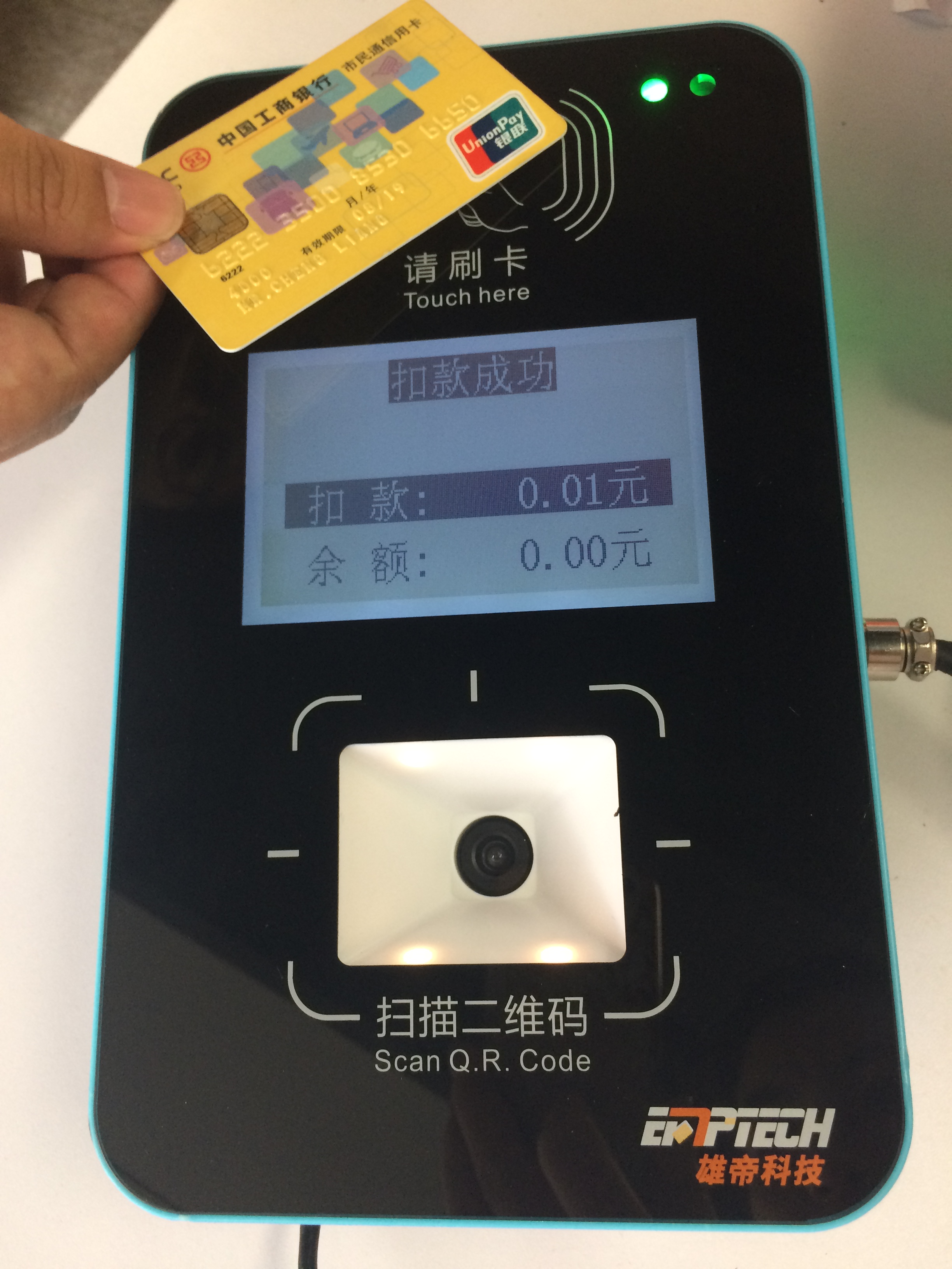 設備上方為閃付、雲閃付功能區,乘客使用具有IC芯片的銀行卡或通過具有NFC功能的手機即可“一觸”支付公交車費。下方是二維碼識別功能區,這裏有高清掃描攝像頭,乘客打開手機中的微信、支付寶等APP的付款二維碼,正對該區域的攝像頭,即可掃描支付車費。